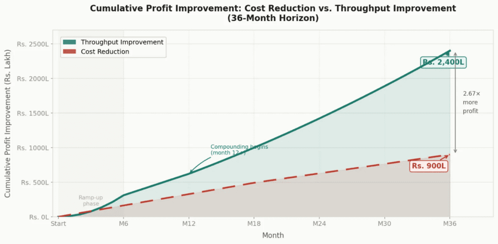 Cumulative profit improvement — Cost Reduction vs. Throughput Improvement over 36 months. Throughput compounds as customer confidence grows and volumes increase. Cost savings plateau.