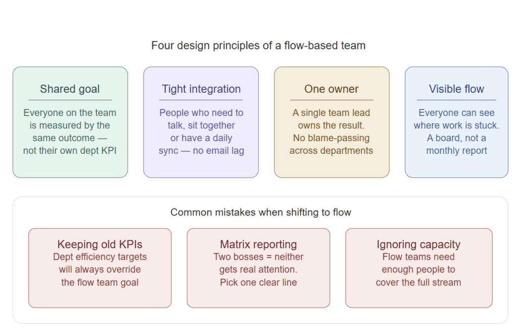 The biggest barrier to flow-based design is not structural — it’s ownership. Department heads lose headcount. Functional reporting lines get disrupted. Specialists worry about career paths outside their professional silos.
